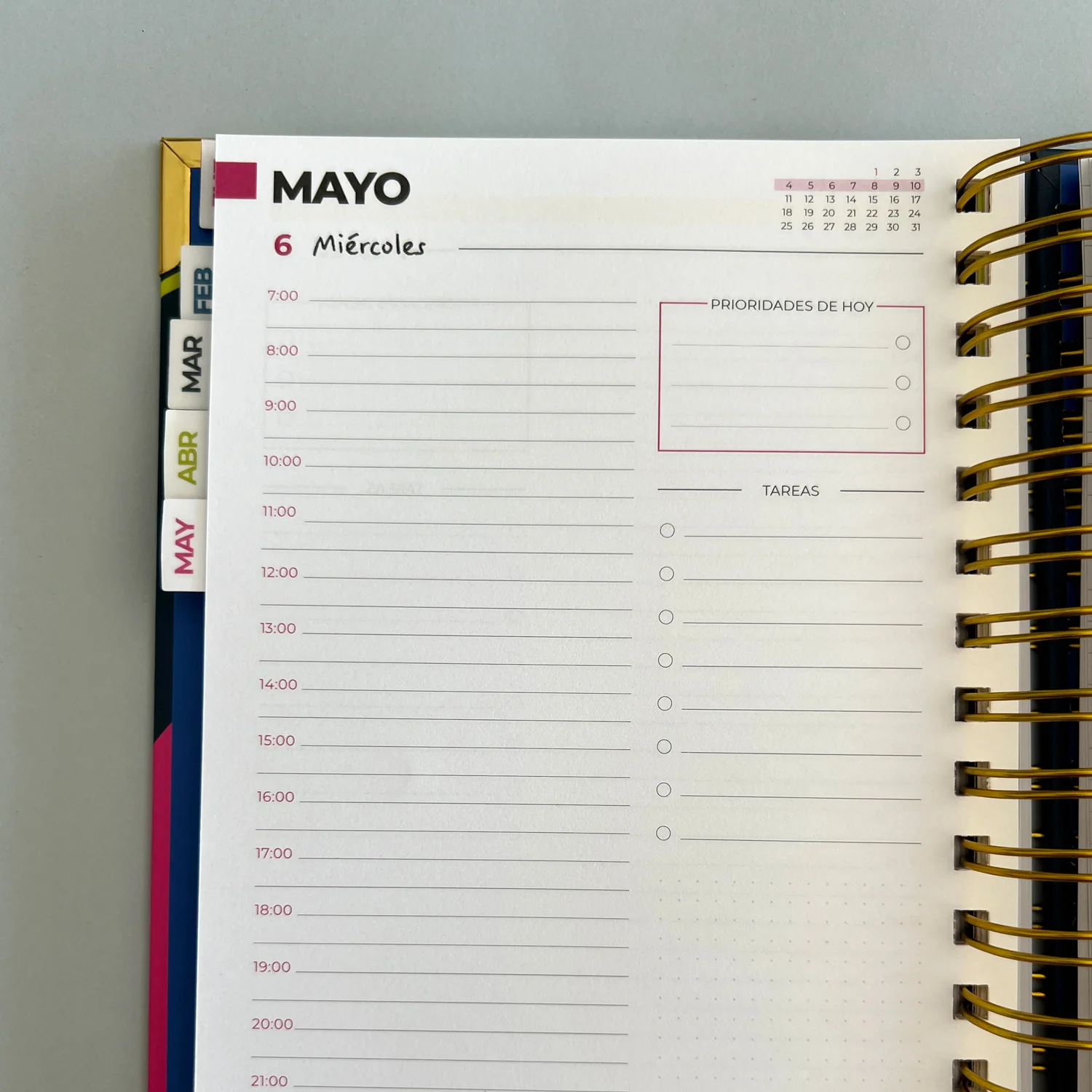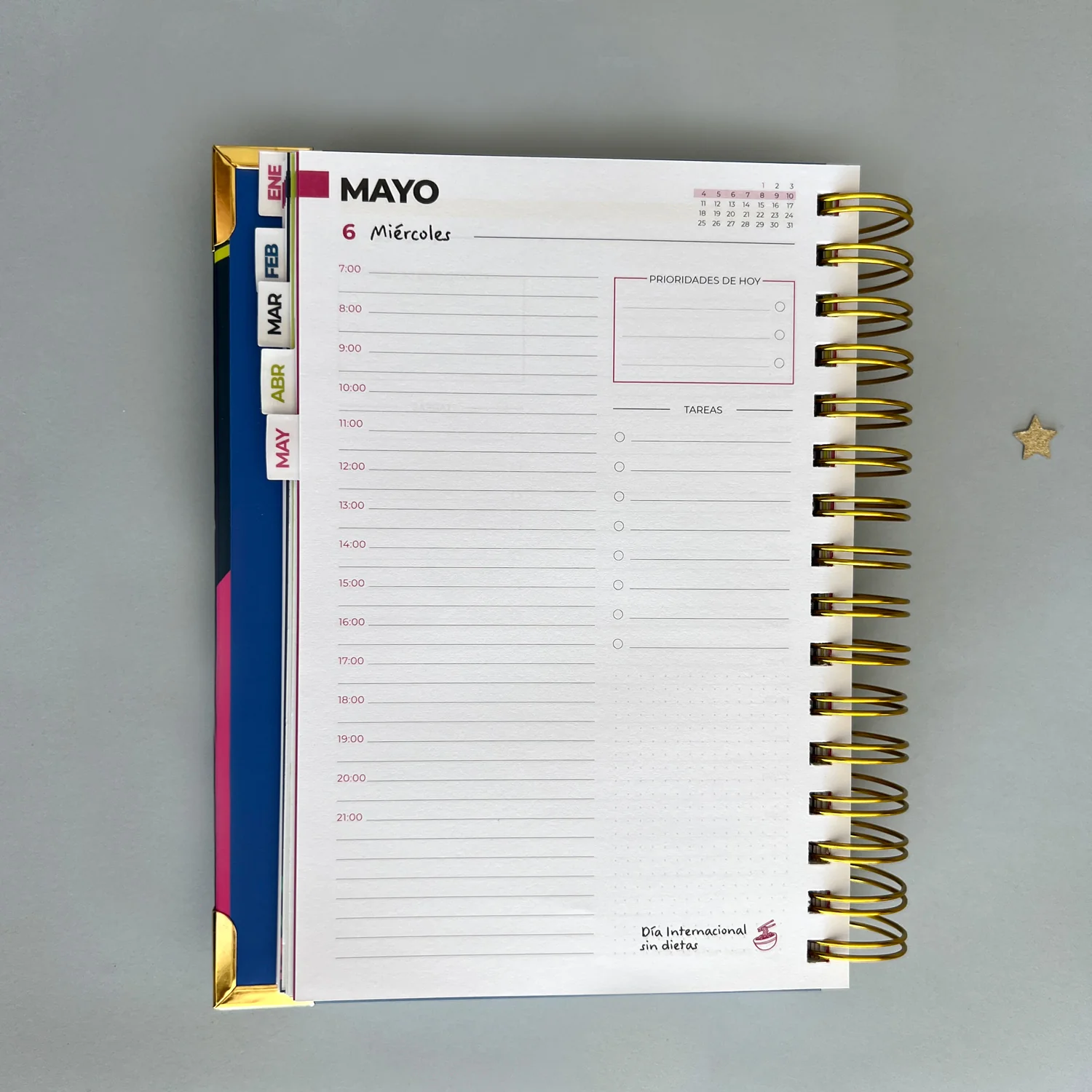Fabricada en tapa dura con anillas y con una planificación súper funcional por horas desde las 7:00 hasta las 21:00 para que no se te escape nada y espacio extra para notas, listas de tareas y prioridades, tiene además al principio de cada mes ilustraciones originales e inéditas y un calendario mensual.