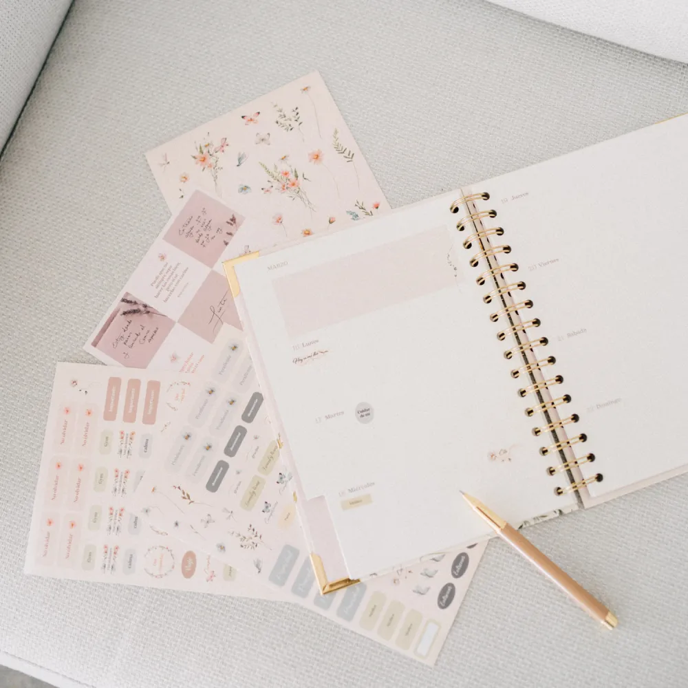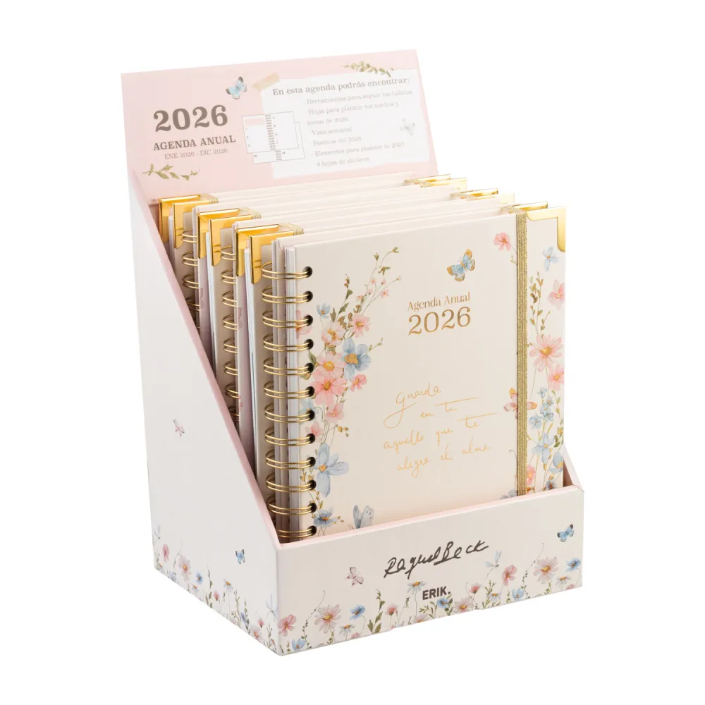 Agenda anual Essential de 12 meses (enero a diciembre). Formato 15,5 x 21 cm, semana vista. Cubierta de tapa dura con encuadernación wire-o. Incluye 2 marcapáginas troquelados, 4 páginas de pegatinas personalizadas y bolsillo interior. 224 páginas de papel de 100 g/m² e interior personalizado, con 16 pestañas separadoras plastificadas. Idioma: español. Características especiales: esquinas metalizadas en la cubierta