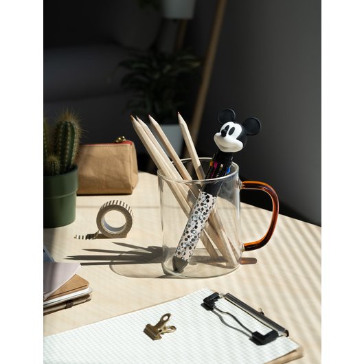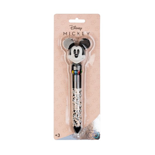 Este bolígrafo de Mickey Mouse pertenece a la colección Disney 100 Aniversario que conmemora los 100 años de la franquicia. Cuenta con un total de 10 colores diferentes y tiene un topper con el icónico rostro original de Mickey en 3D. Está fabricado en PVC.