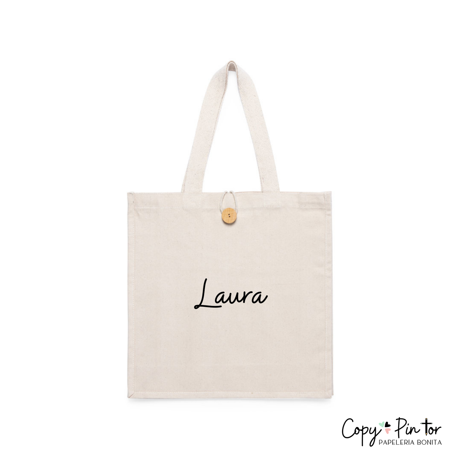 Bolsa fabricada en algodón 100%, de acabado natural y en gramaje extra de 310g/m2. Con original cierre de botón, acabado cosido y con fuelle. Asas medianas extra anchas y reforzadas (60 x 3,5 cm). Resistencia hasta 10 kg de peso.