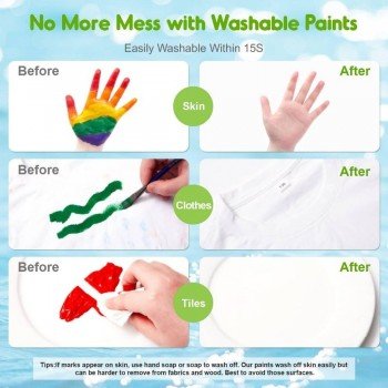 - Características: pintura de dedos lavable y no tóxica; colores brillantes y fáciles de extender; apta para pintar con manos y pies; fomenta el desarrollo sensorial, la creatividad y el aprendizaje temprano; uso versátil en casa y aula.