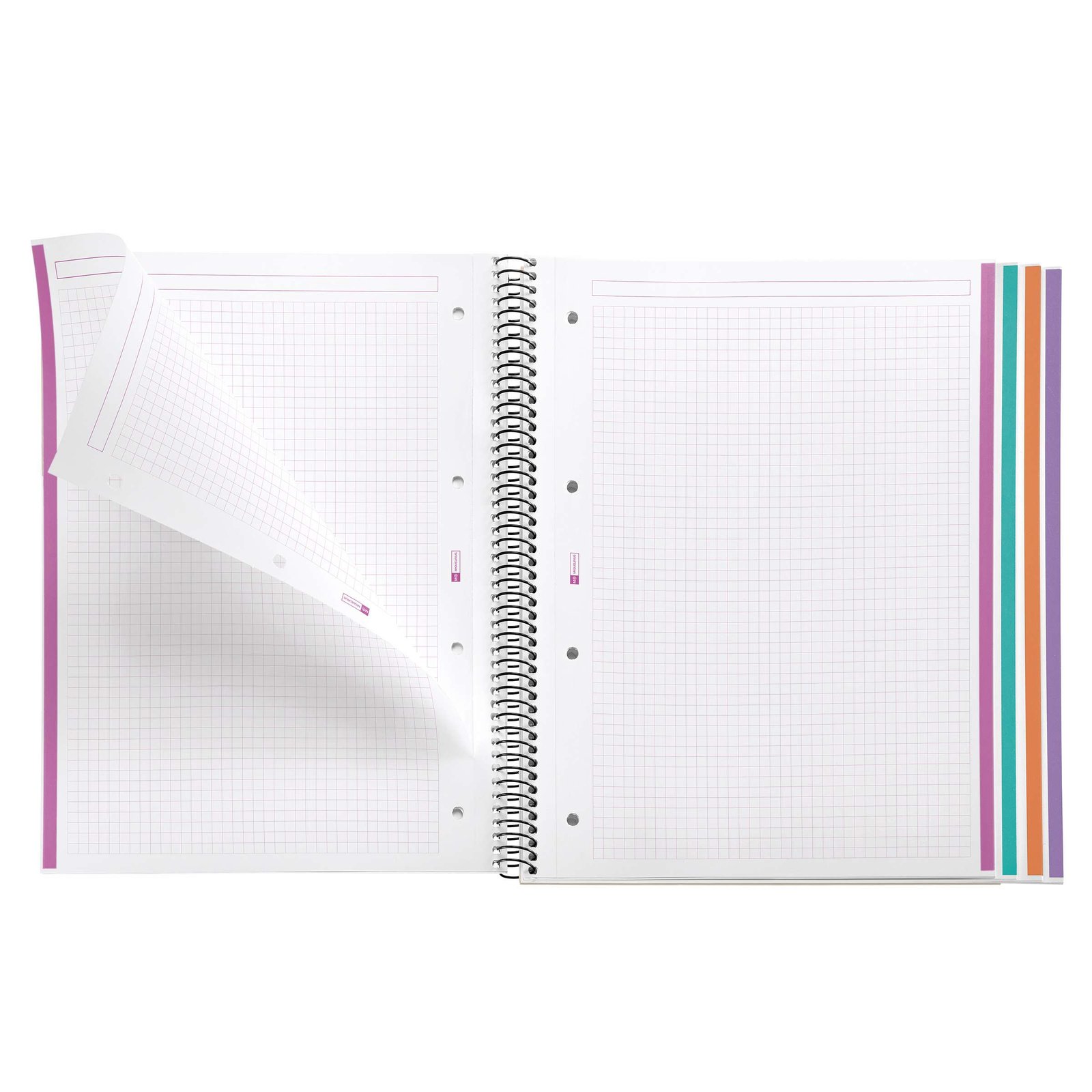 NOTEBOOK 4 – 120 hojas de 4 colores Tamaño A4 Cubiertas: Cartón forrado y plastificado mate. Papel: extra opaco microperforado 70g/m. Cuadrícula 5 x 5 mm Taladros: A4:4
