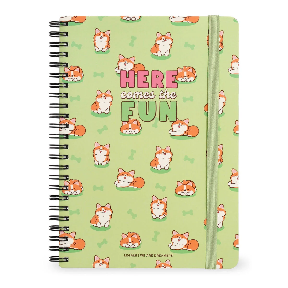 Como dice una famosa canción americana: «Si te gusta, ponle un anillo». Y a nosotros el Cuaderno con Espiral de Rayas Maxi con temática Green Corgi de Legami nos gusta tanto que le hemos puesto anillos en todo el lomo. Es la forma más cómoda de recoger tus pensamientos, notas, pegatinas y adhesivos, ¡y de estar siempre a punto para pasar página y comenzar un nuevo capítulo!