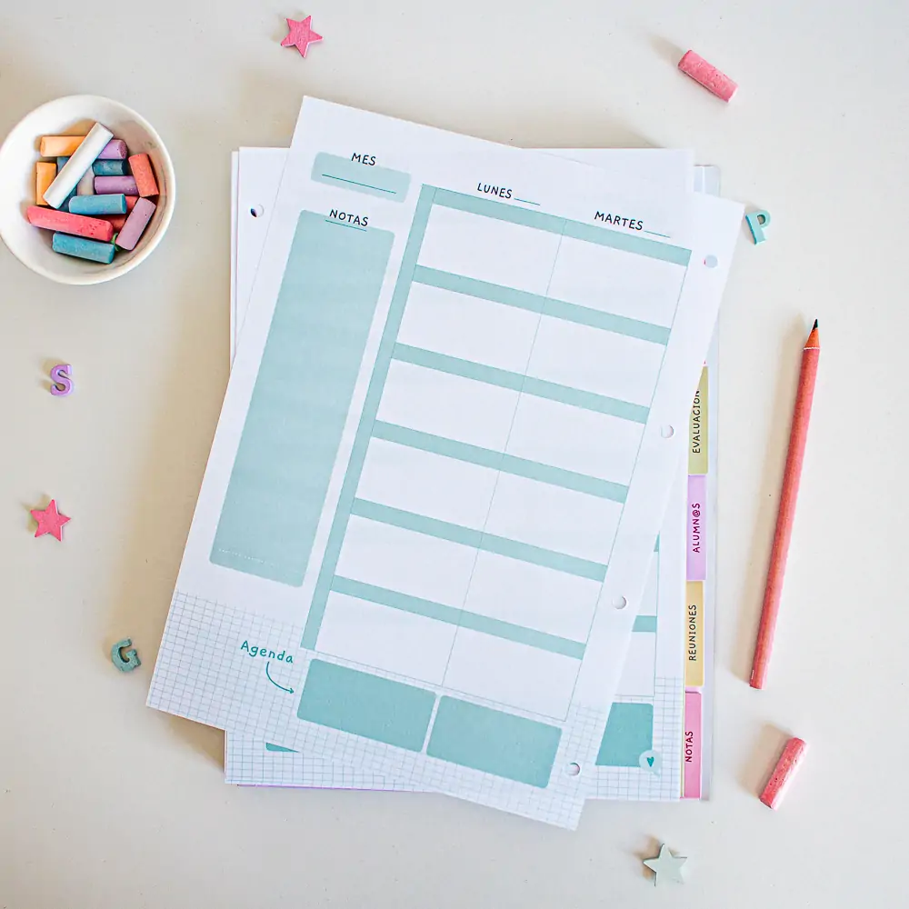- Planificación con vista semanal y 6 sesiones diarias. Además en la parte de abajo incorporamos hueco para que puedas también usarlo como Agenda. Con semanas suficientes para completar todo el curso escolar.