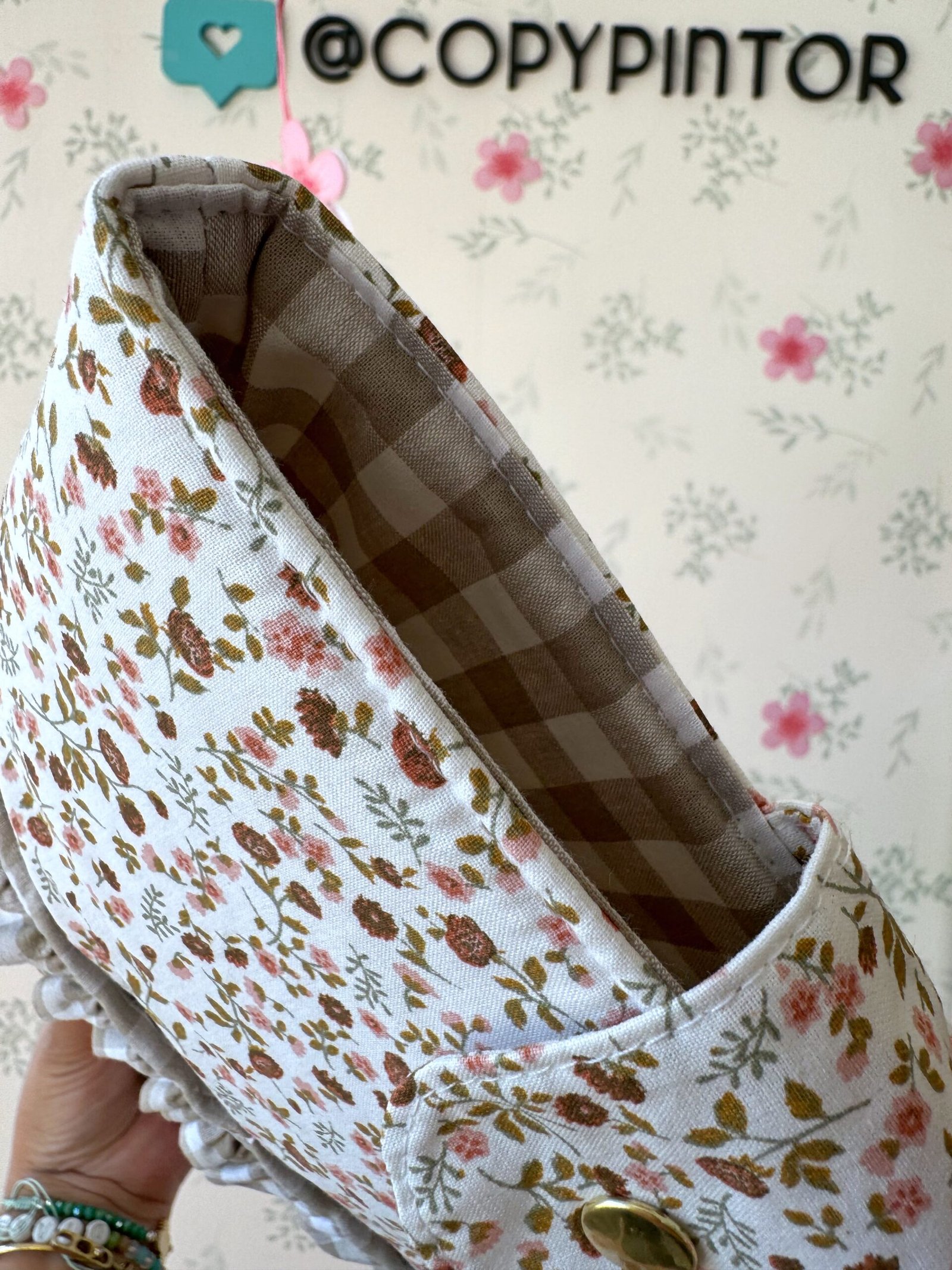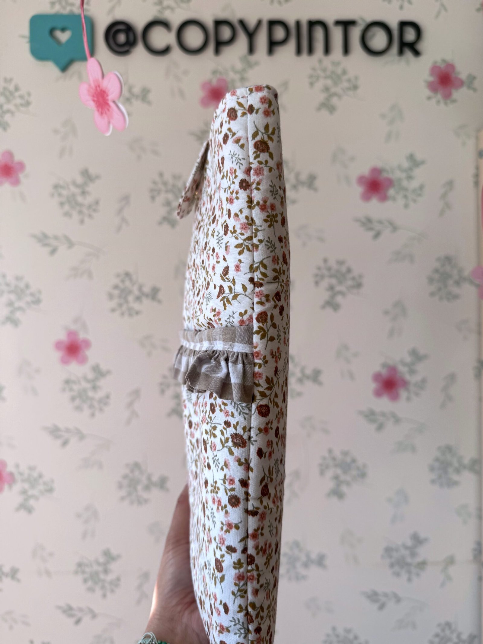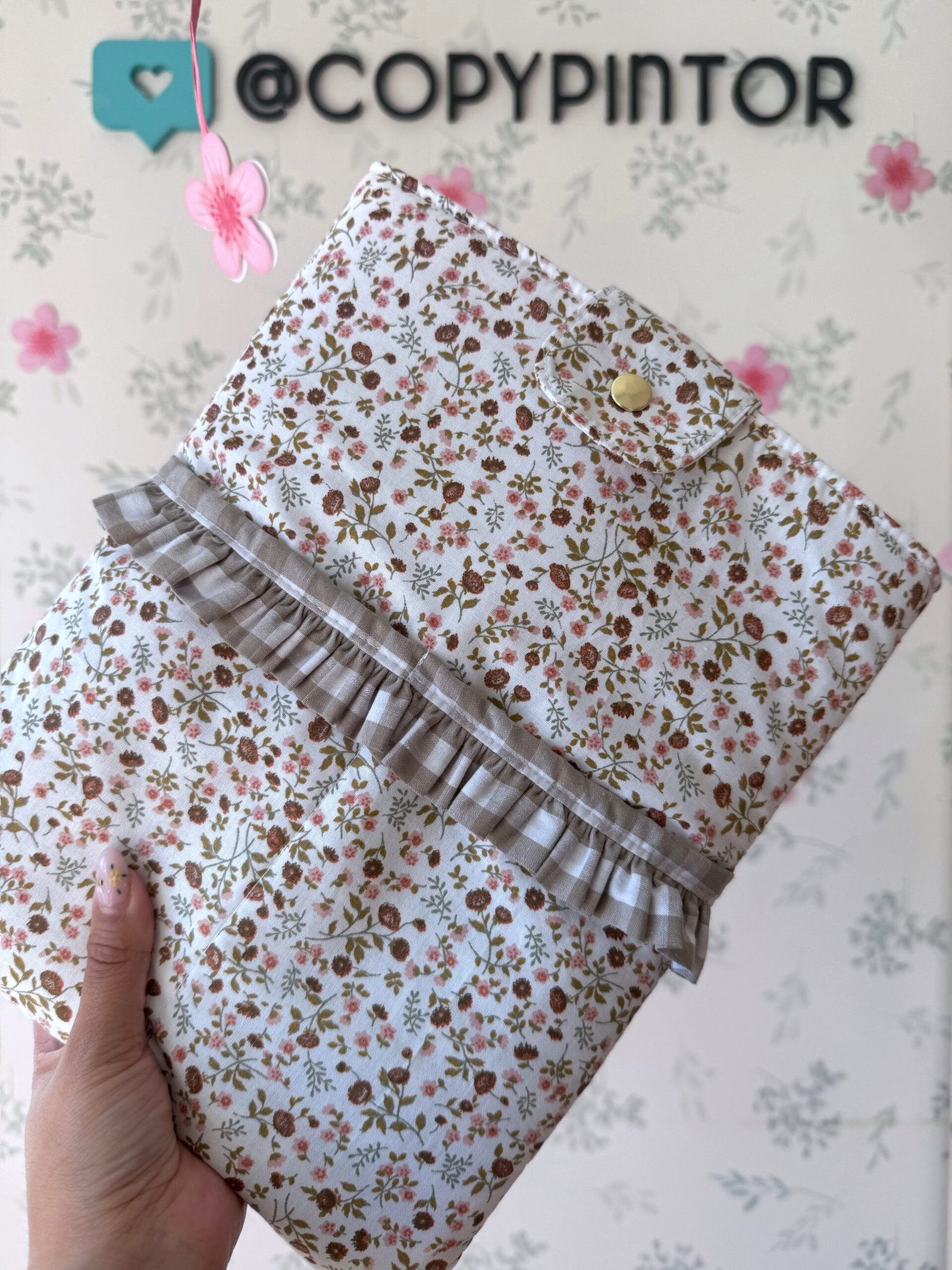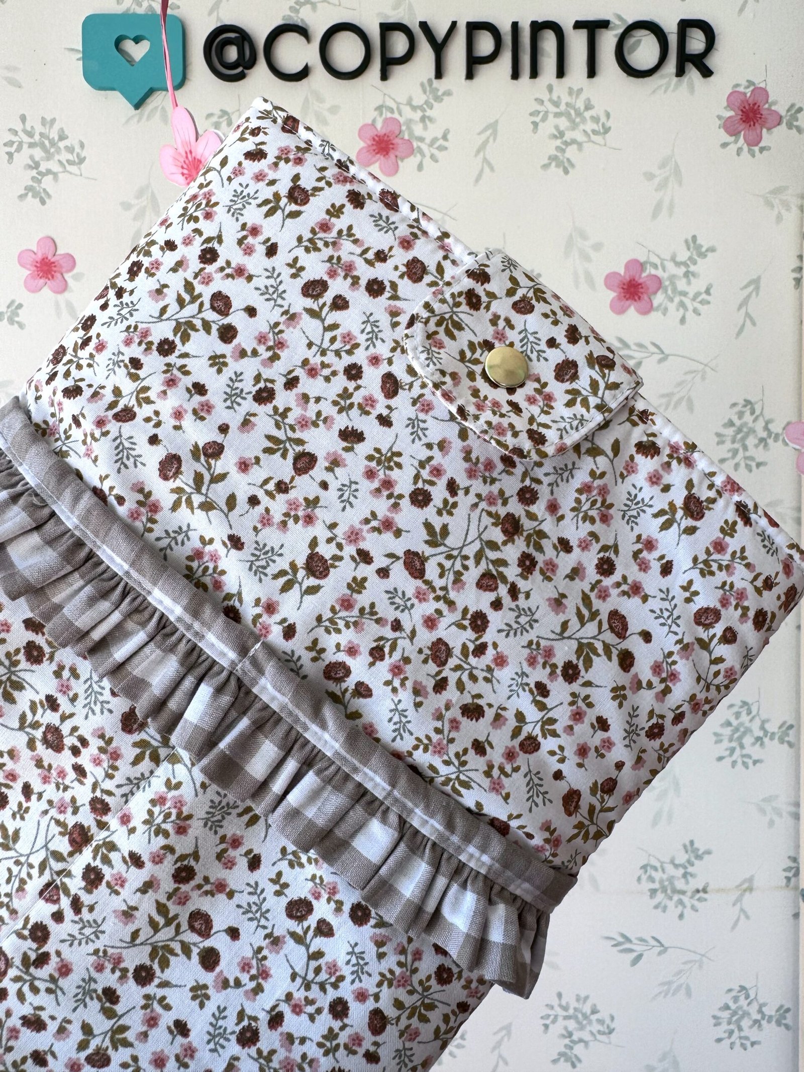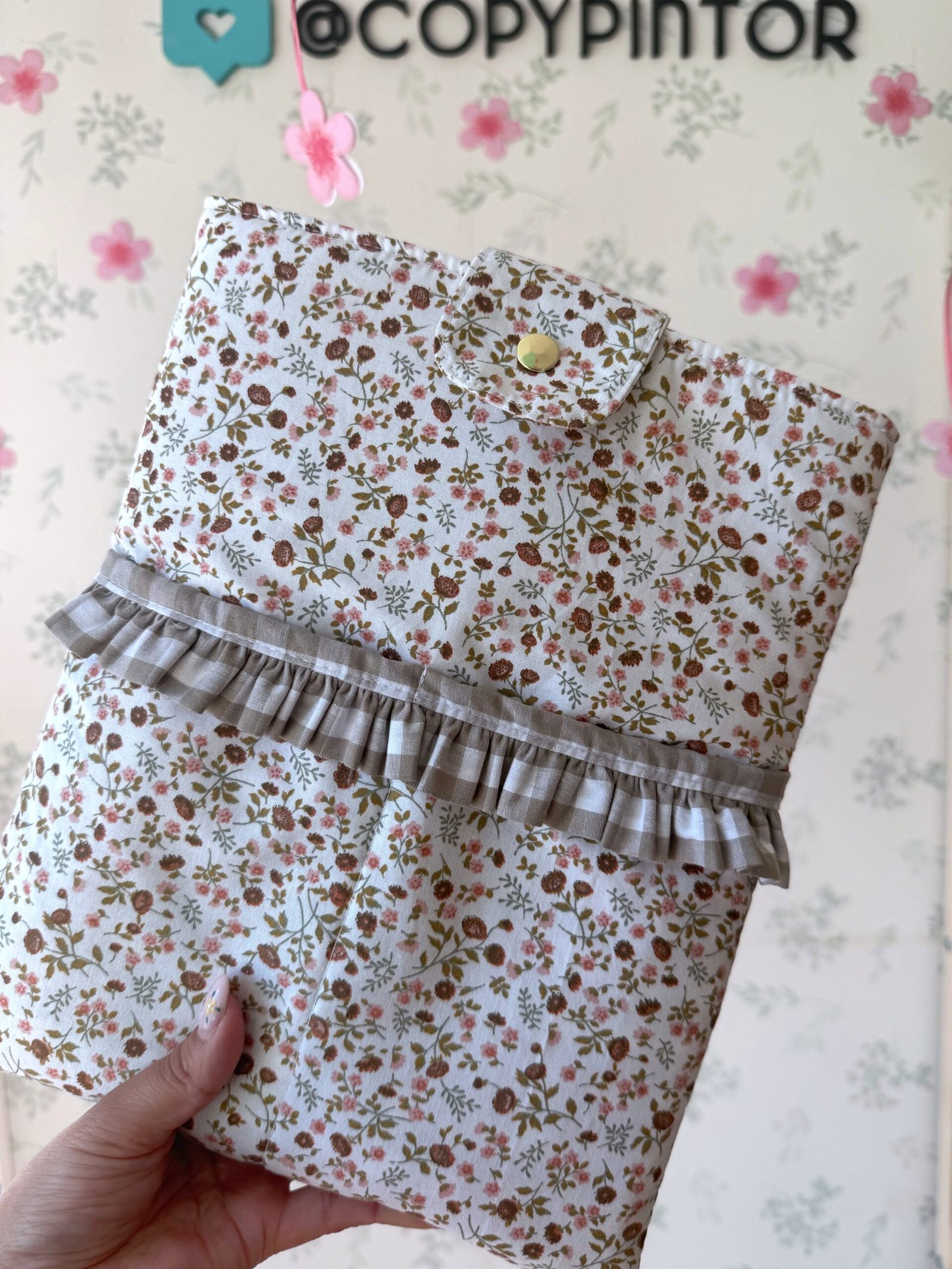 FUNDA LIBRO CIERRE BOTON FLORES MARRONES VOLANTE VICHY BEIS