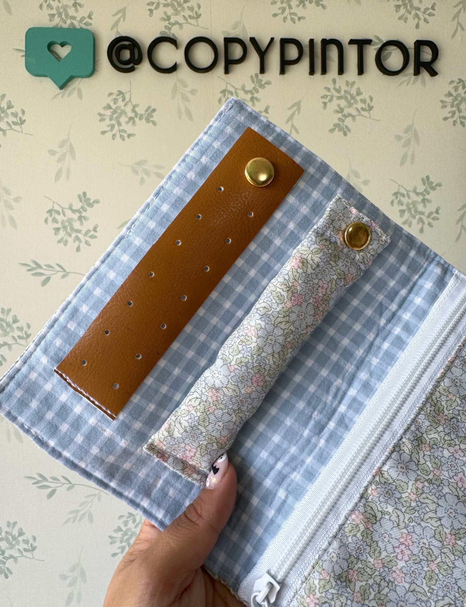 - Cierre con botón dorado para llevarlo todo protegido y ordenado