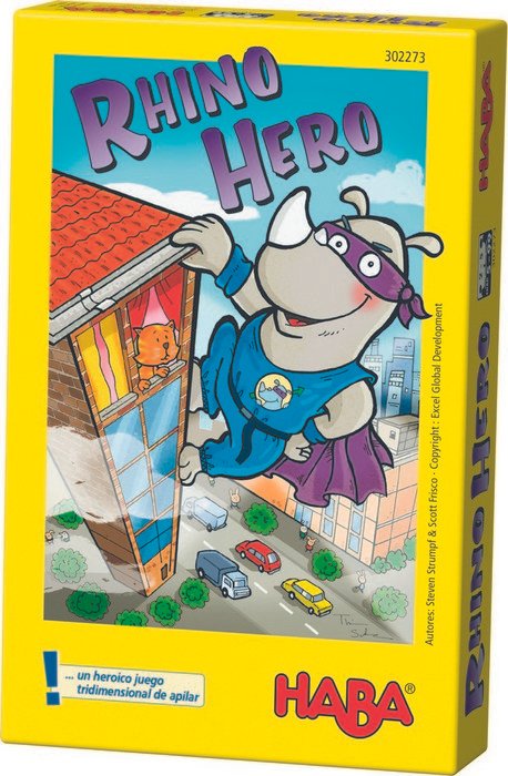 Rhino Hero es un superheroe un poco grande y su capa no soporta su peso, así que deberemos ayudarle a escalar el rascacielos. Nuestra misión será construir el edificio y colocar nuestros techos para ser los mejores constructores o bien intentar que los demás jugadores no consigan que el edificio se aguante en pie. Divertido juego de habilidad y estrategia.