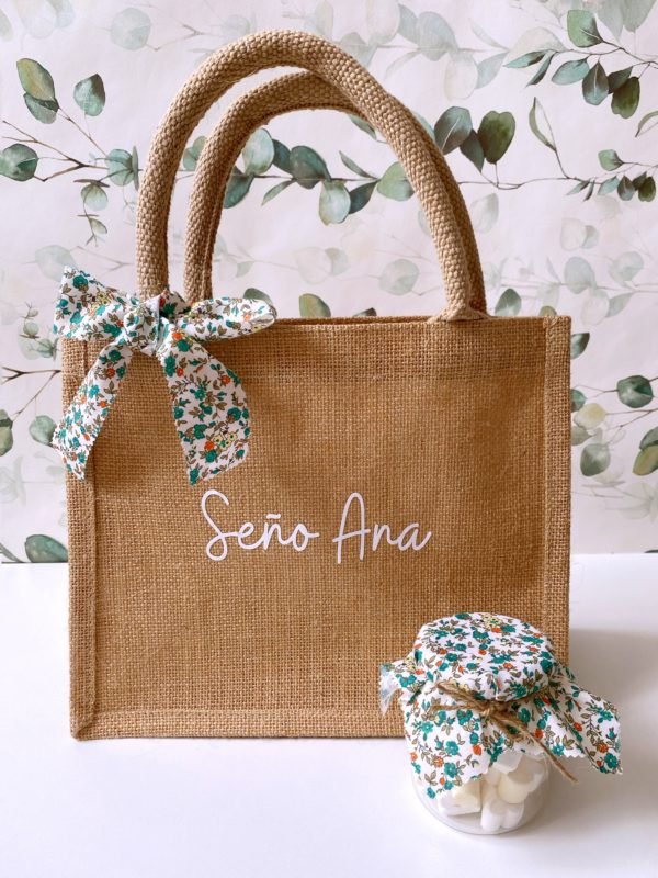 «Kit Mini bolso yute «»Flowers»» Personalizado + Tarro de chuches»