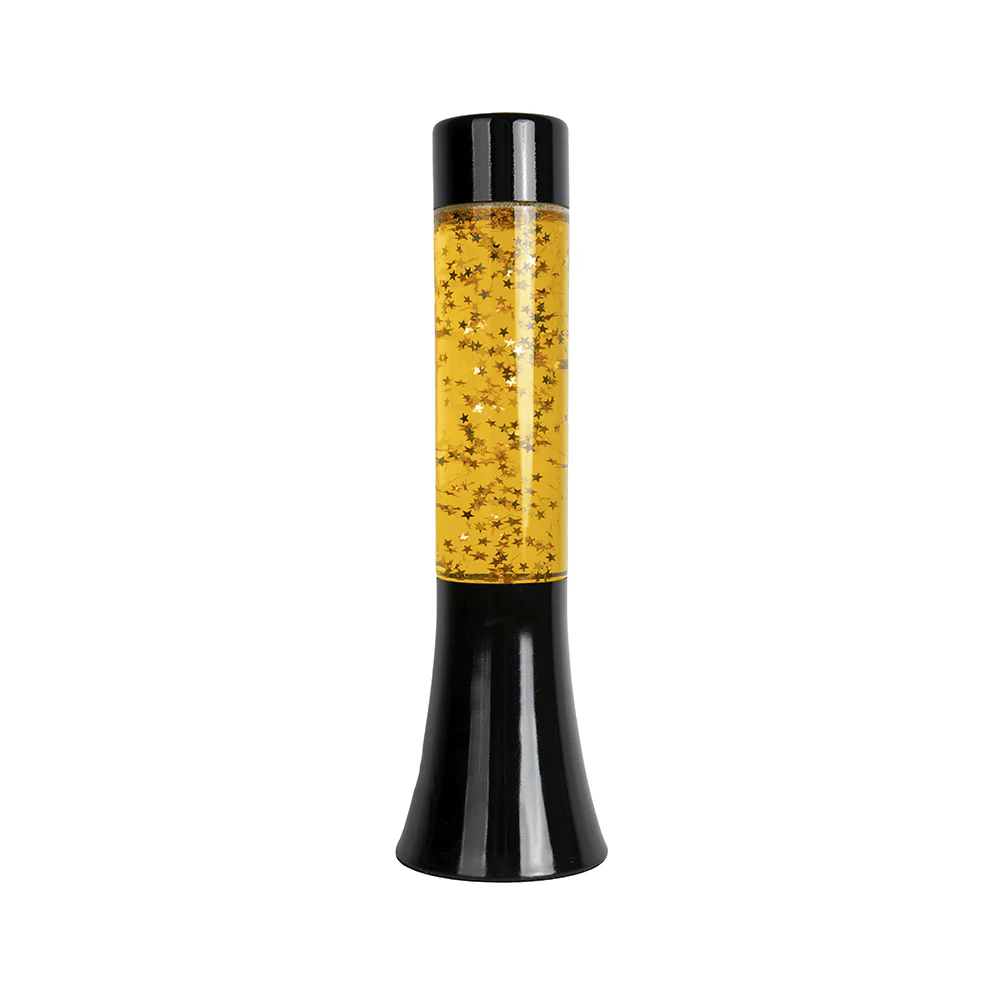 Lámpara de lava glitter de estrellas de 30 cm con base negra y líquido amarillo