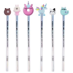 Lápices de madera de color plateado con lápiz HB y figuras de goma. Puedes elegir entre 6 modelos: