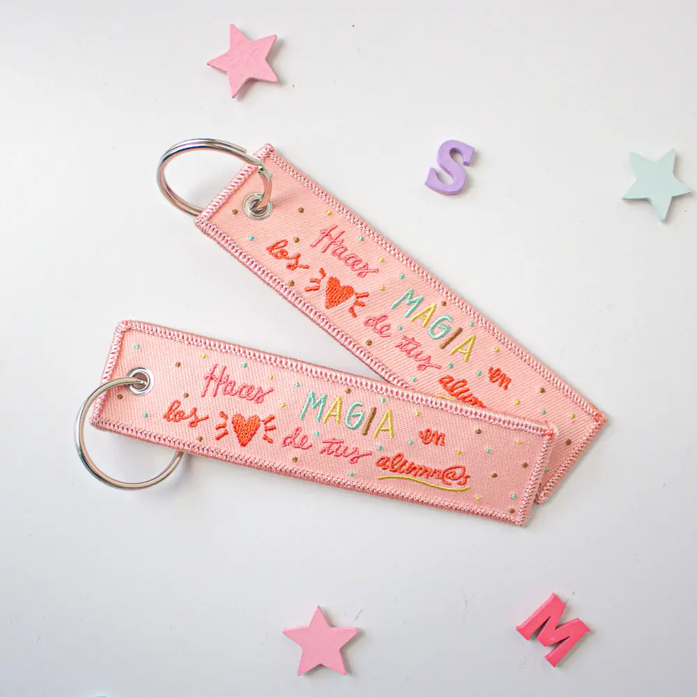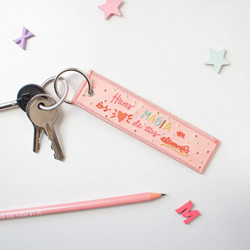 El llavero haces magina en los corazones de tus alumn@s es ideal para llevar tus llaves de aquí para allá y encontrarlas fácilmente. Está fabricado en tela y lleva bordad en ambas caras una de nuestras frases más top