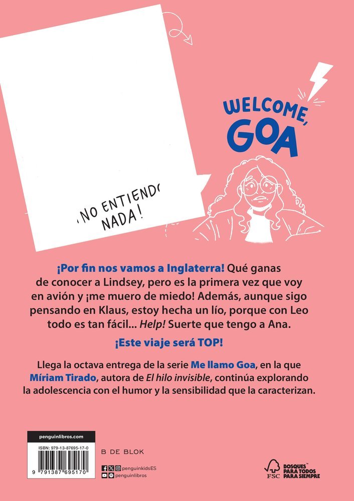 ¡Llega la octava entrega de «Me llamo Goa», la serie juvenil que ha cautivado a más de 200.000 lectores y lectoras jóvenes! ¡Por fin nos vamos a Inglaterra! Qué ganas de conocer a Lindsey, pero es la primera vez que voy en avión y ¡me muero de miedo! Además, Bruno no ha podido venir y yo, aunque sigo pensando en Klaus, estoy hecha un lío porque con Leo todo es tan fácil… Help! Suerte que tengo a Ana, que por cierto está muy contenta porque ella y Laura vuelven a hablar. ¡Este viaje será TOP! Goa empieza el viaje a un nuevo país con sus compañeros, y si ya era difícil tener 13 años en casa, ¡fuera todavía se siente más perdida! ¡Y es que vivir en otro país lejos de su familia es todo un reto! Pero eso no impide que ¡se lo pase bomba! Las nuevas aventuras y nuevos amores permiten descubrirnos todavía más? y Goa está preparada para ello. Una nueva entrega de la serie juvenil de Míriam Tirado, autora de éxitos como El hilo invisible, Sensibles e Infinito. Ida y vuelta, donde explora la adolescencia con el humor y la sensibilidad que la caracterizan.