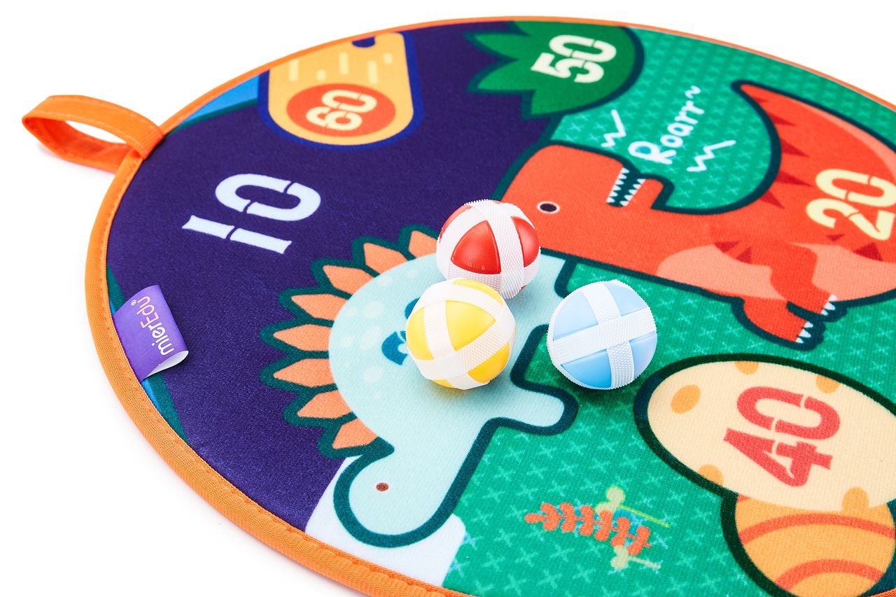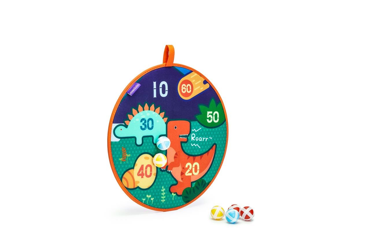 Mi primera diana de Dinomundo esta diseñada para horas de juego divertido con familias y amigos; esta fabricada con una fibra suave que hace que no sea un juego pesado y puedas transportarla en todos tus viajes. Esta diana permite a las niñas y niños practicar su tiro con seis bolas mientras aprenden los números y habilidades esenciales para contar. Ademas de que podrán disfrutar del maravilloso mundo de los dinosaurios disfrutando de sus divertidas ilustraciones. Se puede colgar en la pared o en una puerta y es el juguete perfecto para fiestas o juegos en equipo.
