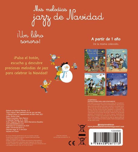 Cada ilustración de este libro esconde un botón que hará sonar canciones de Navidad al ritmo de jazz. La calidad del sonido y las preciosas ilustraciones hacen que esta colección de libros sonoros no pare de crecer.¡Un libro de sonidos perfecto para celebrar la Navidad a ritmo de jazz!