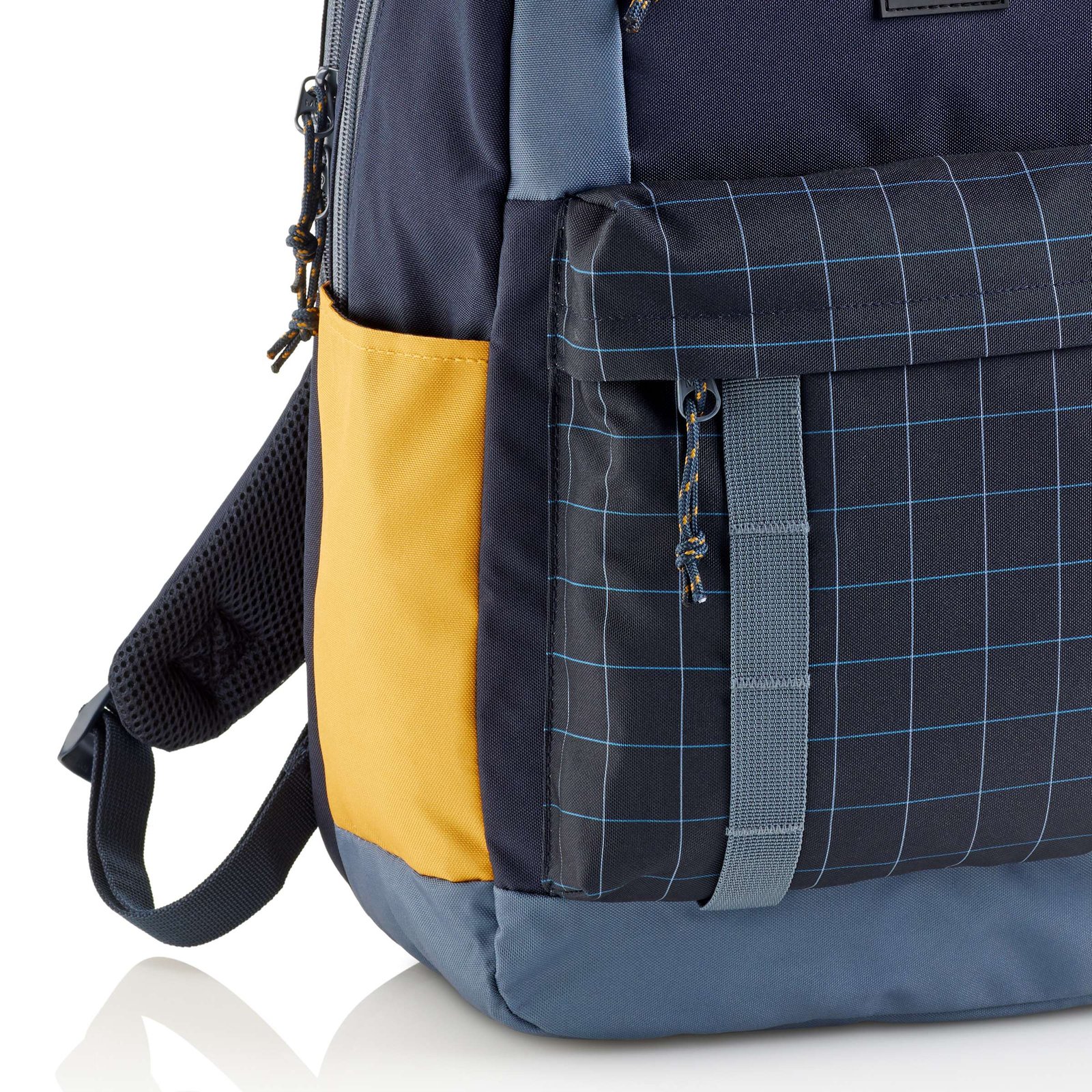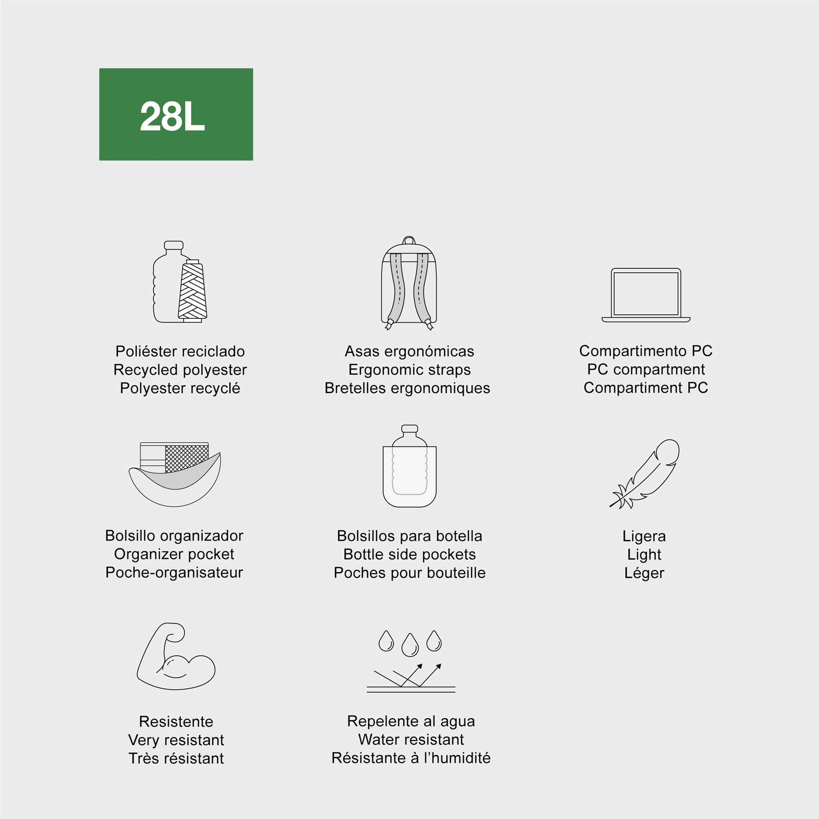 Mochila con tres compartimentos, dos principales y uno frontal. Composición exterior de RPET (poliéster reciclado). Forro interior de poliéster. Los dos compartimientos principales con cierre de doble cremallera. Bolsillo organizador. Bolsillos laterales para botellas. Llavero interior. Cierres para candado. Medidas: 470 x 250 x 155 mm. Capacidad: 28L. Hecha con botellas de plástico recicladas.