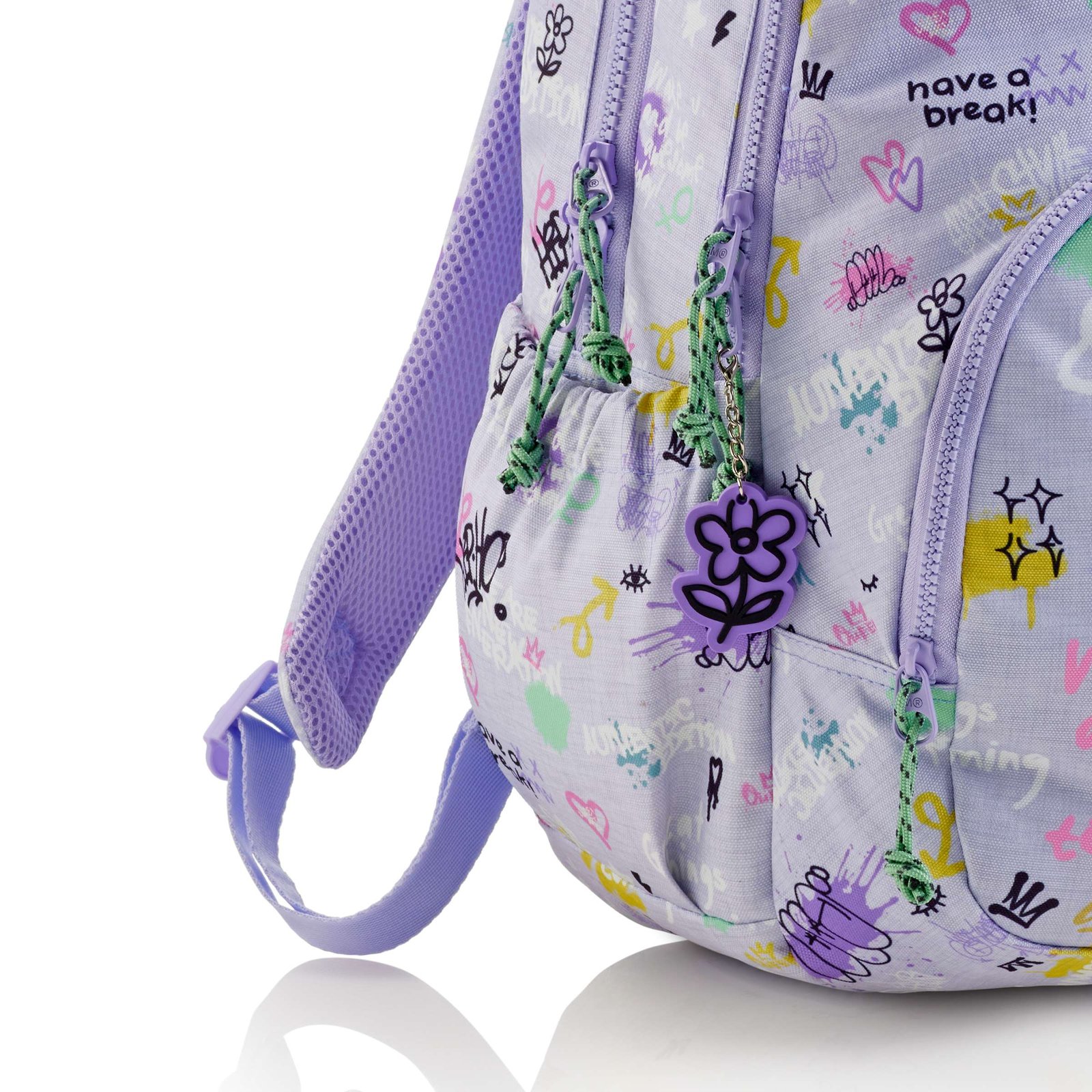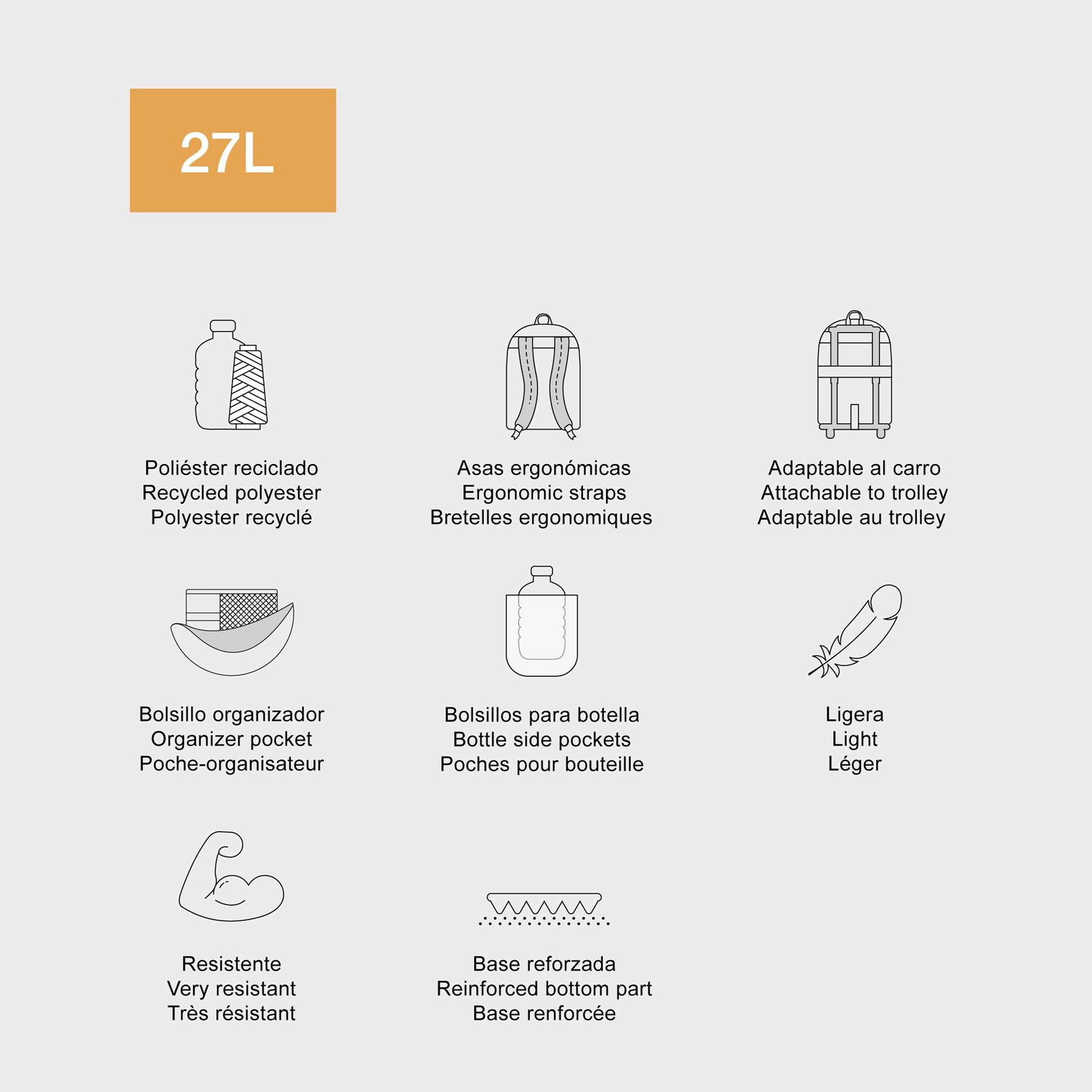 Mochila con tres compartimentos, dos principales y uno frontal. Composición exterior de RPET (poliéster reciclado). Forro interior de poliéster. Los dos compartimentos principales con cierre de doble cremallera. 27L.