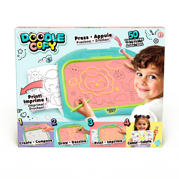 Descubre la Doodle Copy, ¡el juguete perfecto para aprender a dibujar! Sólo tienes que elegir una plantilla, colocarla en la máquina y calcarla. Una vez que hayas terminado, ¡pulsa el botón para imprimir tu dibujo! Sólo te queda colorearlo.