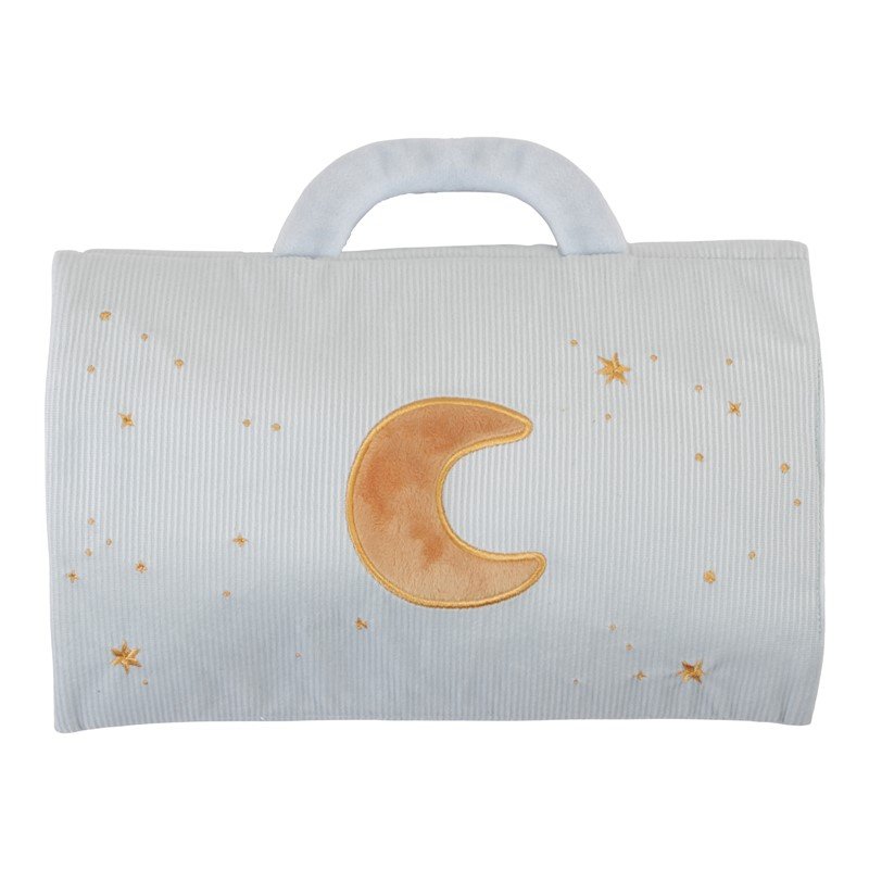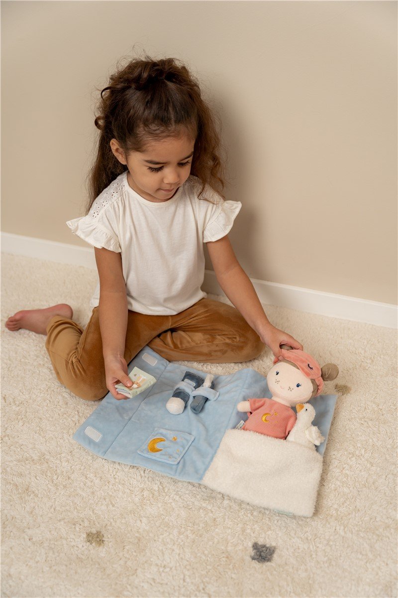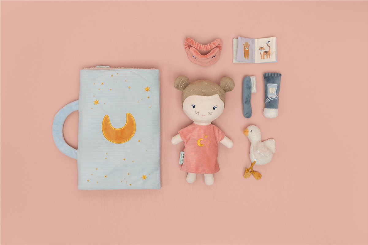 Es hora de dormir! Mira a Rosa en su lindo pijama, simplemente no puede esperar para dormir juntos. Ha empacado su maleta con todos los elementos esenciales para pasar la noche. Por supuesto, su juguete de peluche favorito, Little Goose, se va . con ella. ¿Dónde te gustaría dormir juntos? ¿En tu habitación o estás planeando una visita a la casa de tus abuelos? Dondequiera que vayas, Rosa está ahí para abrazarla y jugar.Este juego de pijamas de muñecas fomentará muchas horas de juego de simulación. La suave maleta azul claro se pliega para convertirse en una cama y lleva los accesorios para dormir más encantadores para imitar el ritual de la hora de acostarse. Su pequeño puede poner a Rosa en su pijama, prepararse para la hora de acostarse con el cepillo de dientes y la pasta de dientes, acurrucarse con Little Goose y leer un cuento antes de dormir del libro incluido con ilustraciones de animales. A la hora de irse a dormir, tu pequeño puede ponerse el antifaz para dormir de Rosa y taparla con la manta de peluche. Noche noche Rosa.
