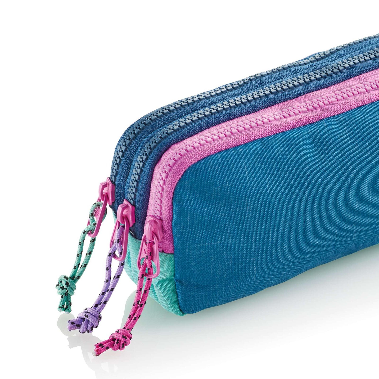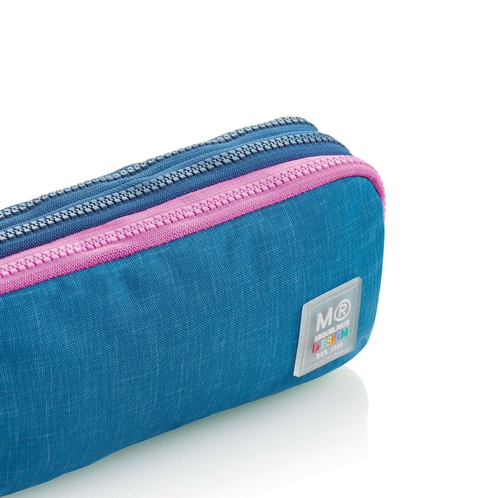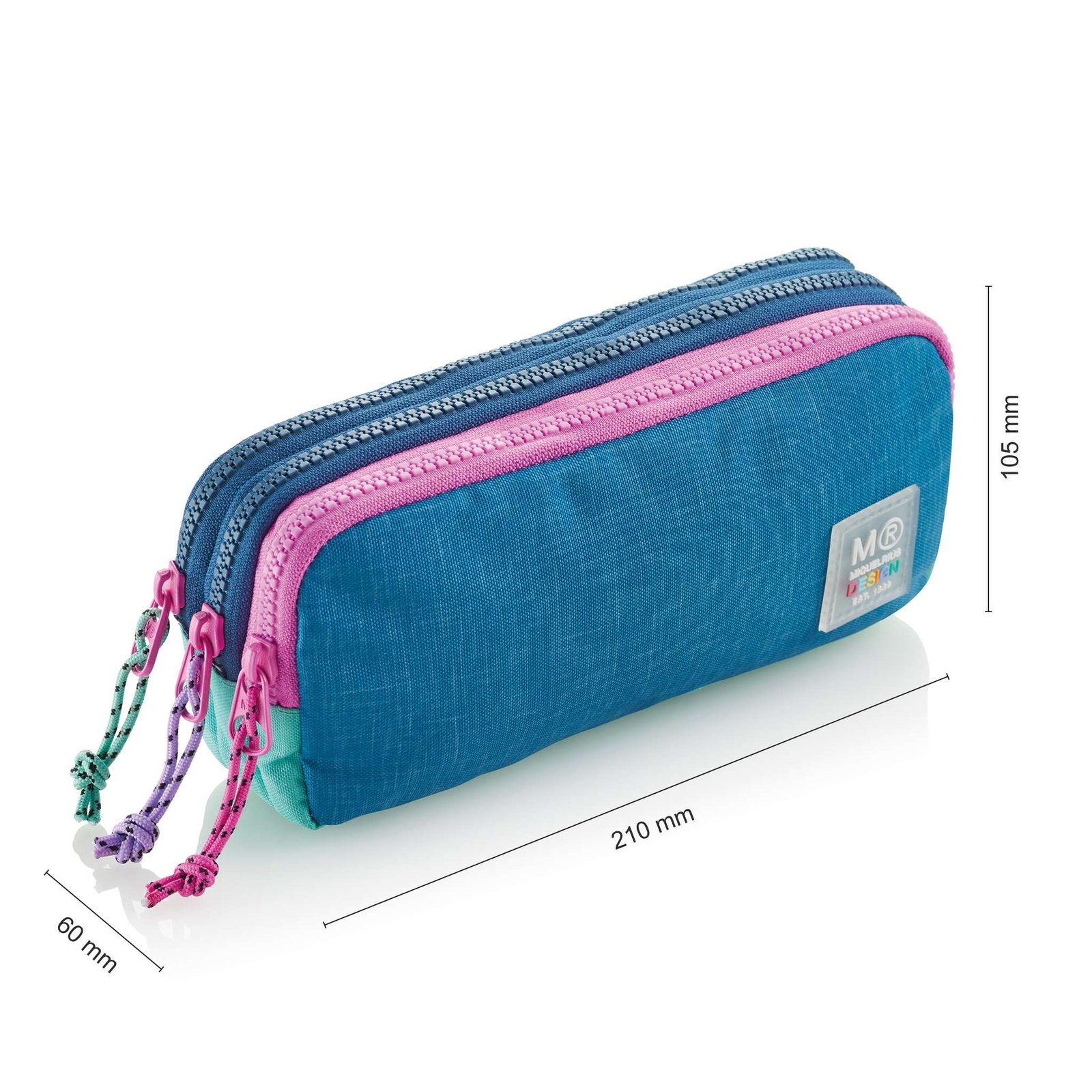 Estuche portatodo triple Miquelrius. Tamaño: 210 x 105 x 60 mm Estuche con triple compartimento con cierre cremallera. Cremallera de plástico de alta calidad, muy resistente. Con tiradores metálicos con cinta para facilitar la apertura. Perfecto para organizar todos los objetos de material escolar. Material: RPET (poliéster reciclado a partir de botellas de plástico). Respetuoso con el medio ambiente.