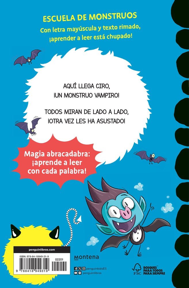 ¡APRENDE A LEER EN LA ESCUELA DE MONSTRUOS! Con letra mayúscula y texto rimado, ¡aprender a leer está chupado! A Ciro le encanta convertirse en vampirito: cuando le salen las alas, ¡puede dar sustos de muerte! Pero a sus amigos no les hace tanta gracia… ¿cómo lo hará Ciro para demostrar que ser un vampiro es divertido? La Escuela de Monstruos es la serie más divertida para aprender a leer: – Letra mayúscula – Frases rimadas – Vocabulario sencillo – Ilustraciones a todo color – Protagonistas geniales: ¡una clase de monstruos! Los niños y niñas ganarán confianza para disfrutar de la lectura y practicarán nuevo vocabulario en las actividades de cada libro. ¡No te pierdas la serie con la que los más pequeños aprenderán a disfrutar de los libros!