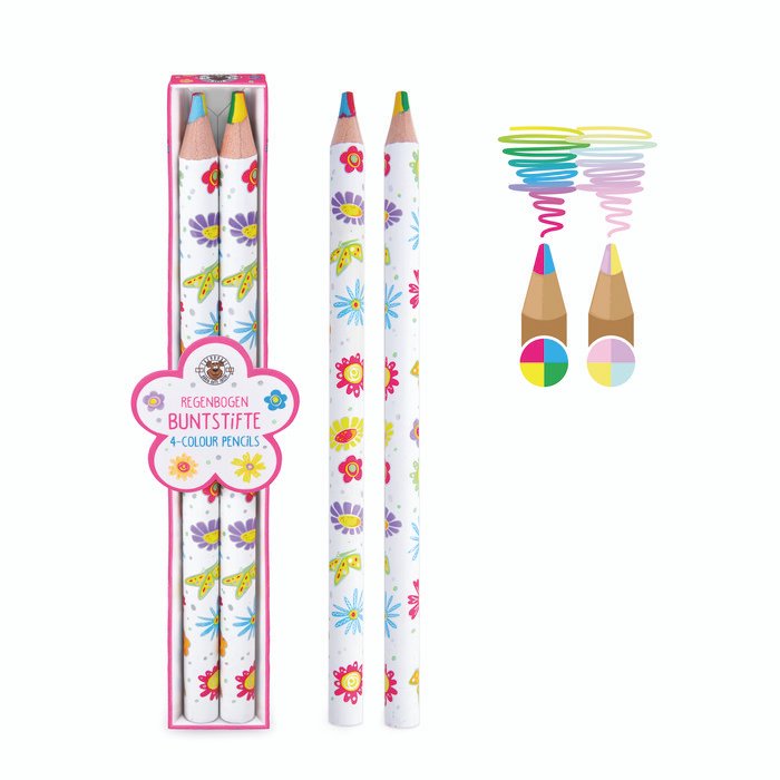 Estos lápices de colores de madera multicolores constan de una mina de lápiz con 4 colores diferentes (pastel o colores clásicos). El diseño exterior tiene un acabado plateado y el elegante estuche de almacenamiento destaca por sus colores neón y su relieve plateado.