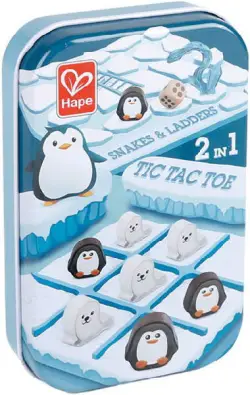 ¡2 juegos en 1! Prueba el clásico por excelencia: el tres en raya y añade más diversión con Serpientes y Escaleras. Tan solo tira el dado y observa cuán lejos llega. Puedes subir por las escaleras, ¡pero cuidado con las serpientes en la bajada! Este juego tiene el tamaño perfecto para llevar de viaje en su cómodo estuche metálico. Composición: caja metálica, cartón y madera Medidas caja: 8,5 x 13,2 x 2,7cm A partir de 3 años