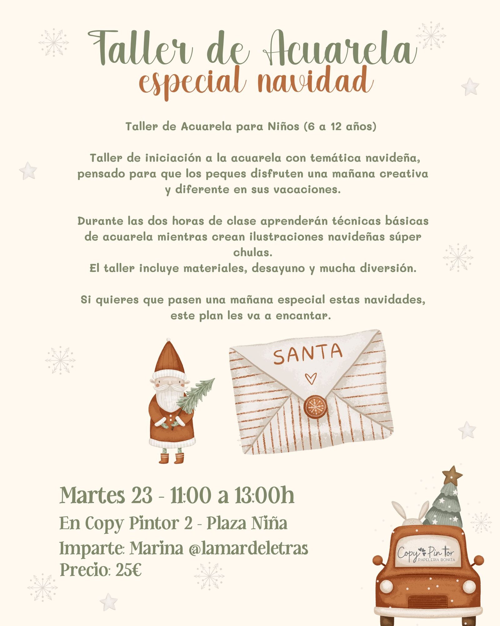 Taller de iniciación a la acuarela con temática navideña, pensado para que los peques disfruten una mañana creativa y diferente en sus vacaciones.
