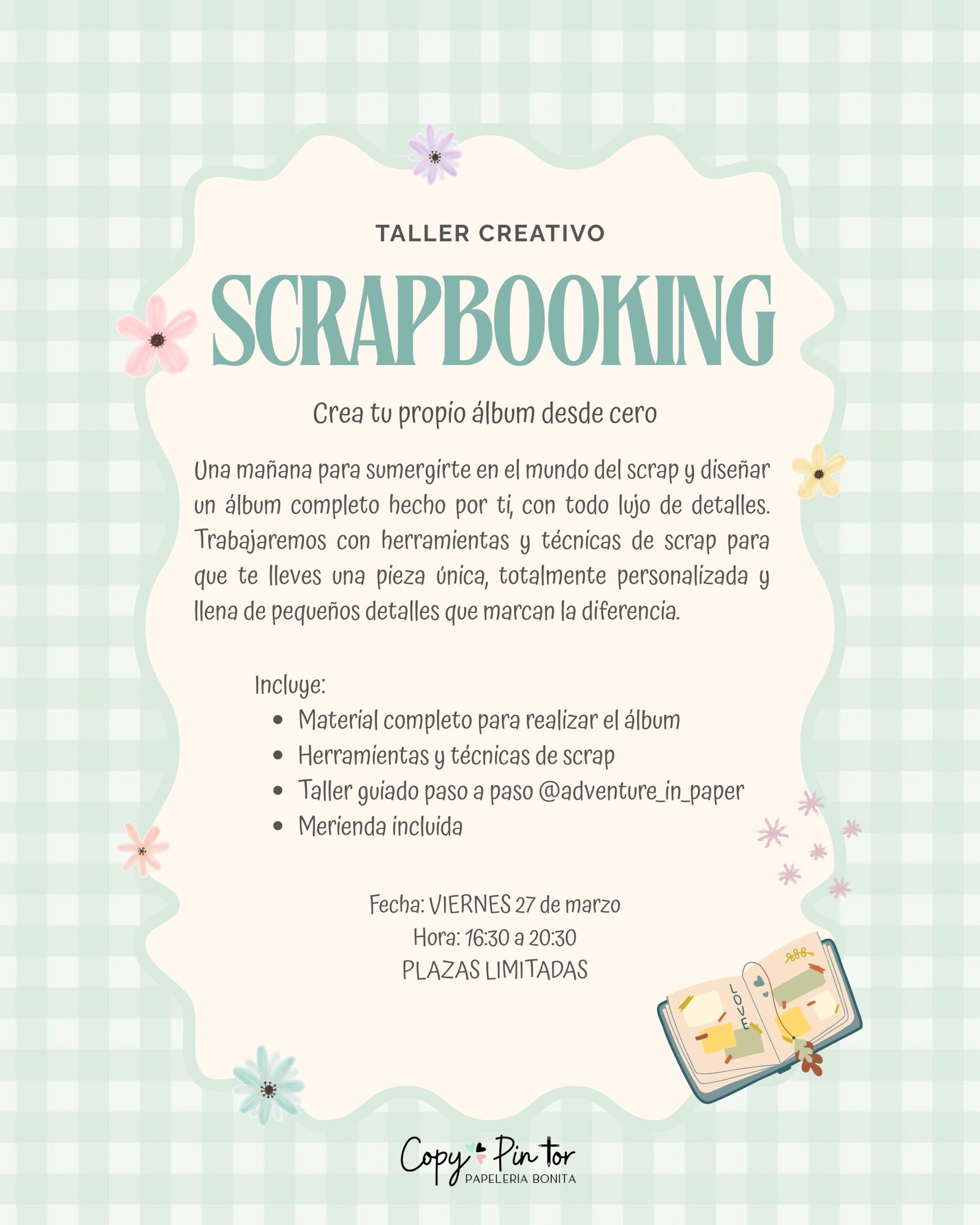 Una mañana para sumergirte en el mundo del scrap y diseñar un álbum completo hecho por ti, con todo lujo de detalles. Trabajaremos con herramientas y técnicas de scrap para que te lleves una pieza única, totalmente personalizada y llena de pequeños detalles que marcan la diferencia.
