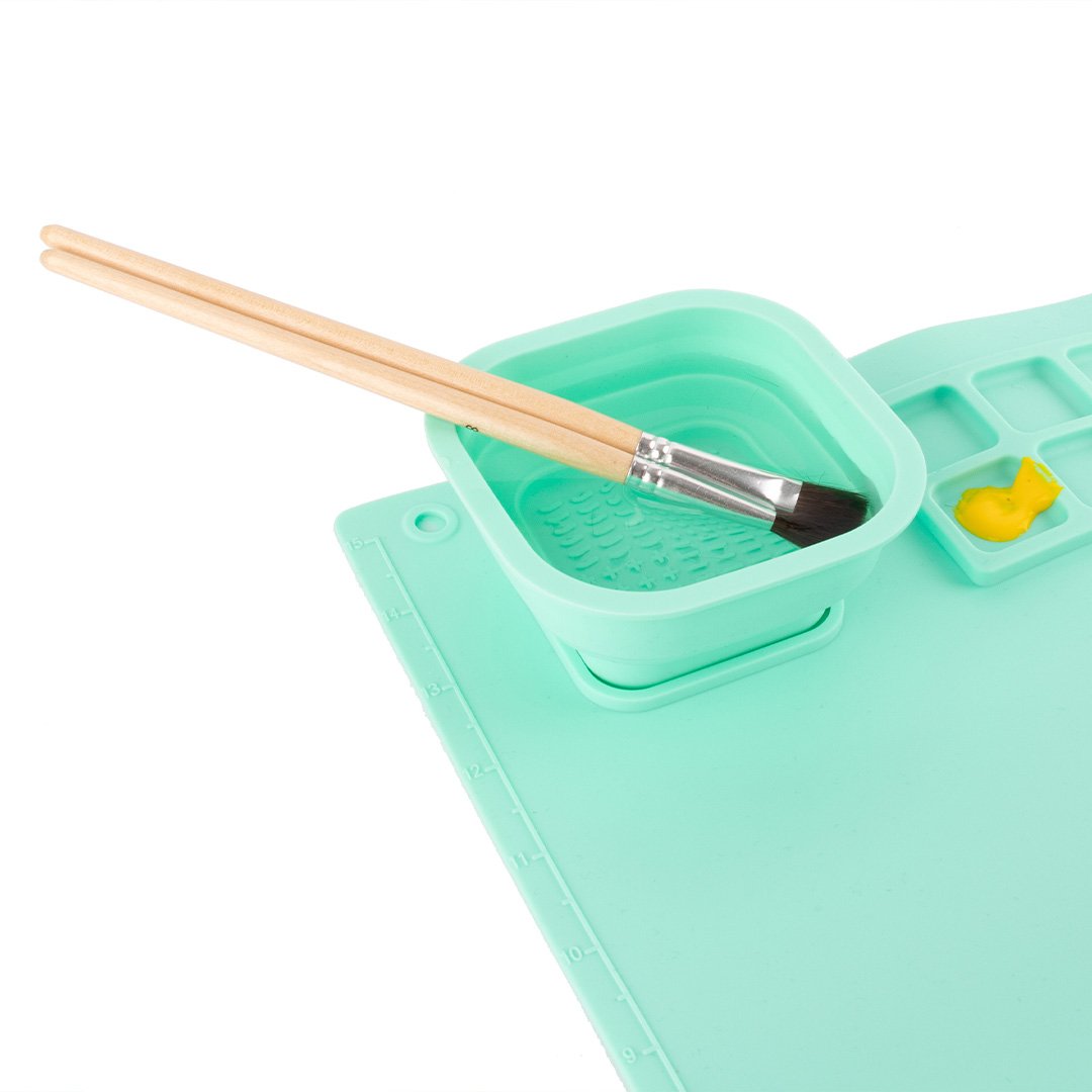 Su superficie antideslizante evita desplazamientos ofreciendo mayor seguridad y su diseño flexible facilita el almacenamiento y transporte. El vaso plegable incluido permite lavar los pinceles de manera práctica y mantener el espacio ordenado. ¡Perfecto para pintar y crear todo tipo de manualidades creativas!
