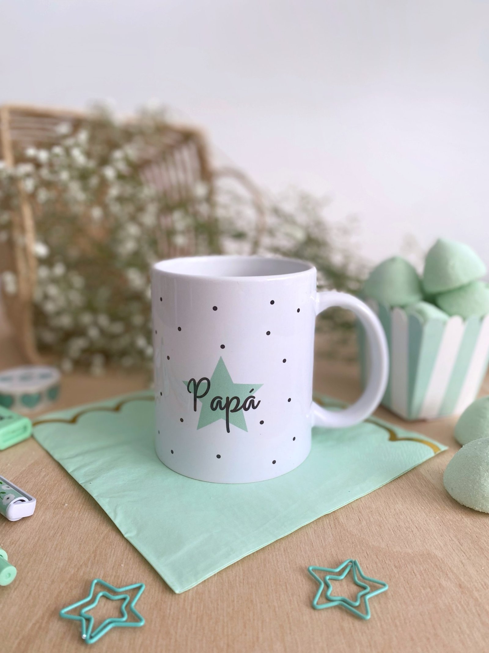 Queríamos tener una taza con un diseño muy nuestro, pero con un trocito tuyo. Así que he hemos diseñado está, tan bonita en color blanco, con lunares negros y una estrella, donde podrás elegir el color, mint o rosa y añadirle tu nombre favorito.