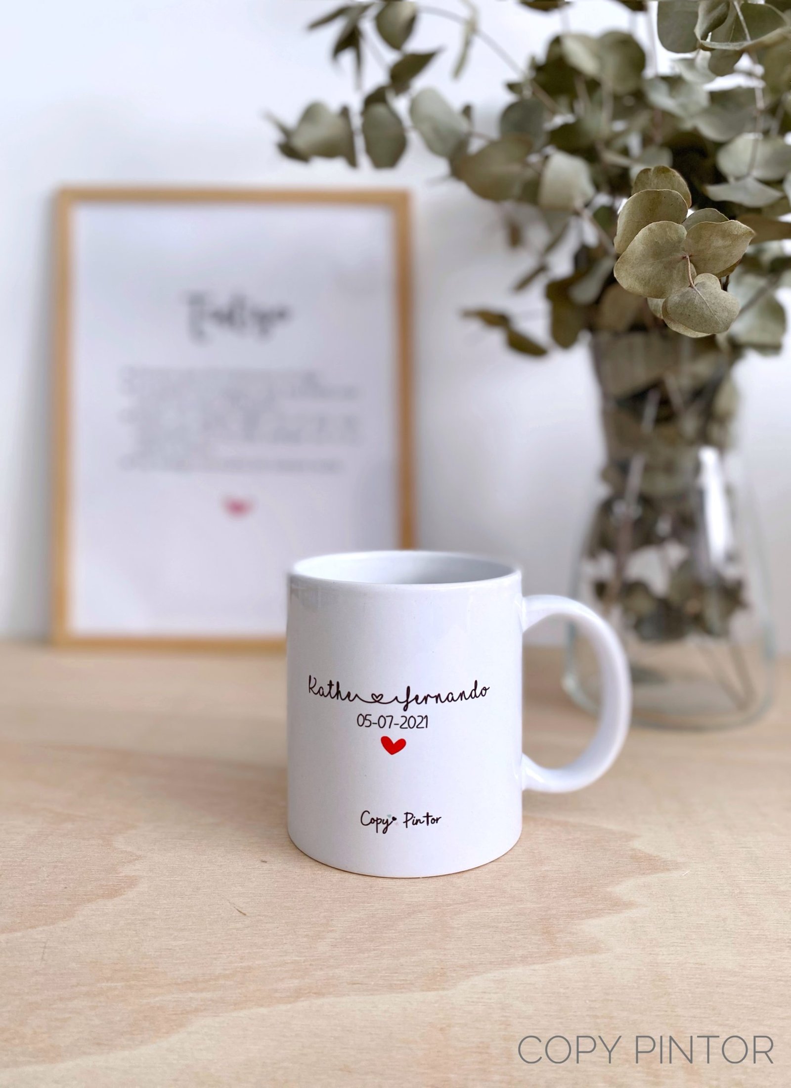 Diseño de Copy Pintor, taza en sublimación de alta calidad, apta para lavavajillas y microondas. Taza blanca con asa en forma de corazón e interior rojo.